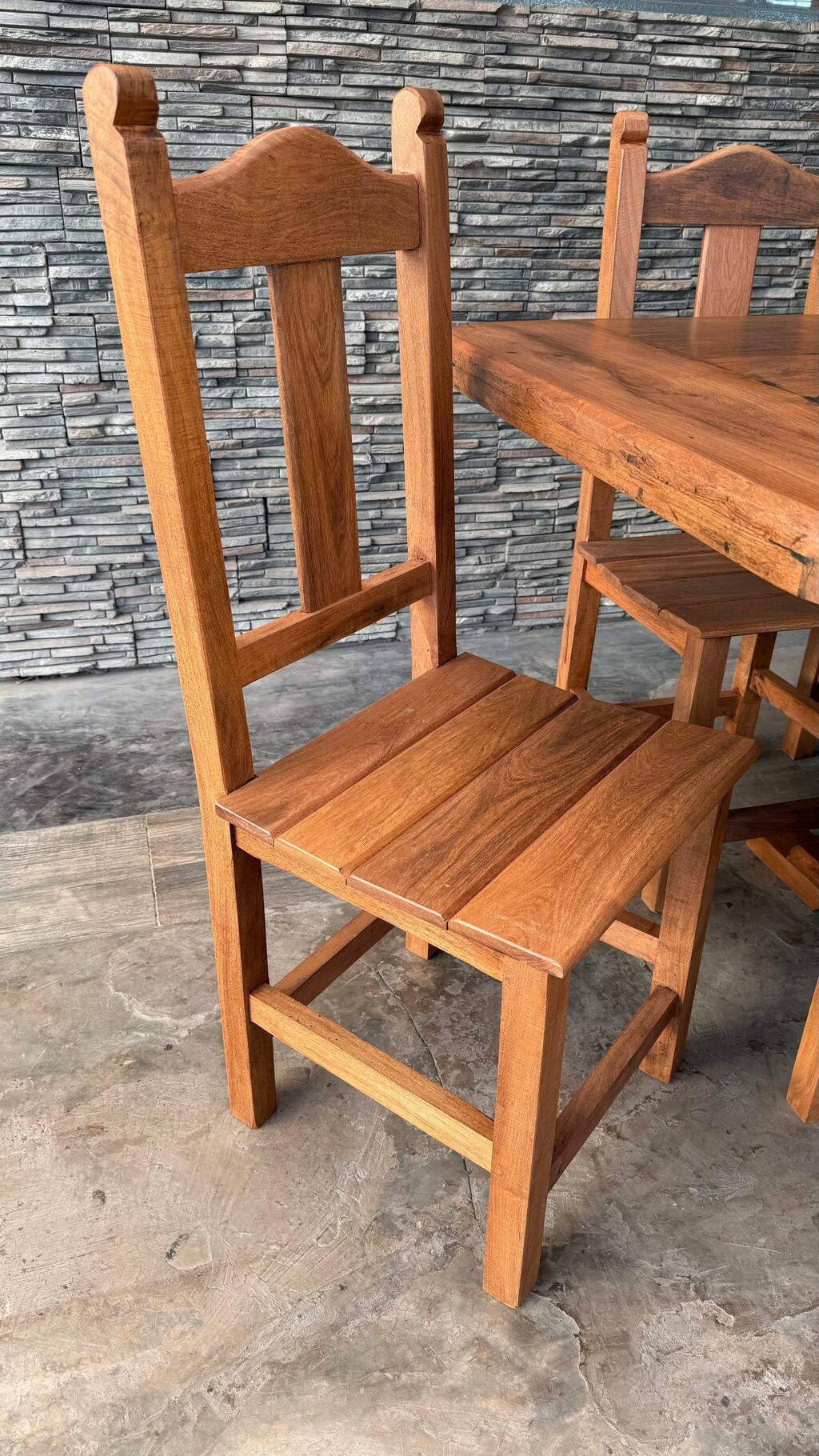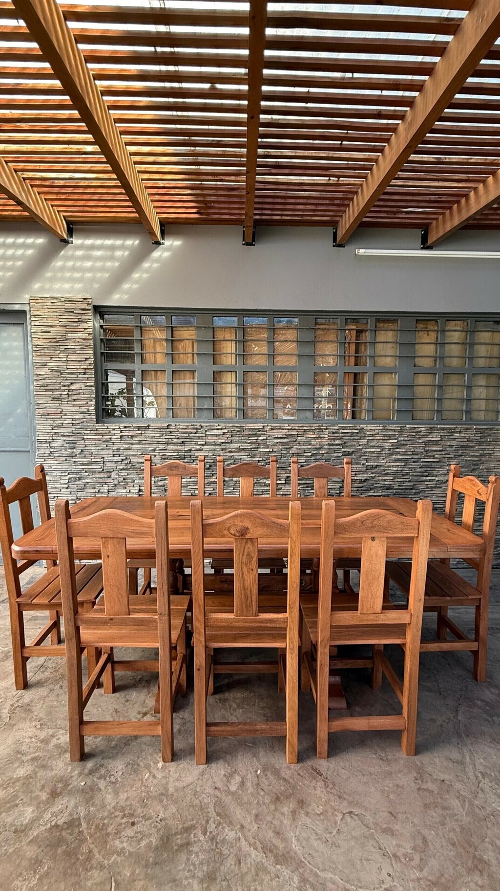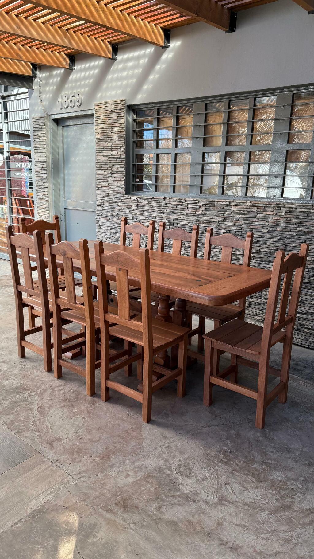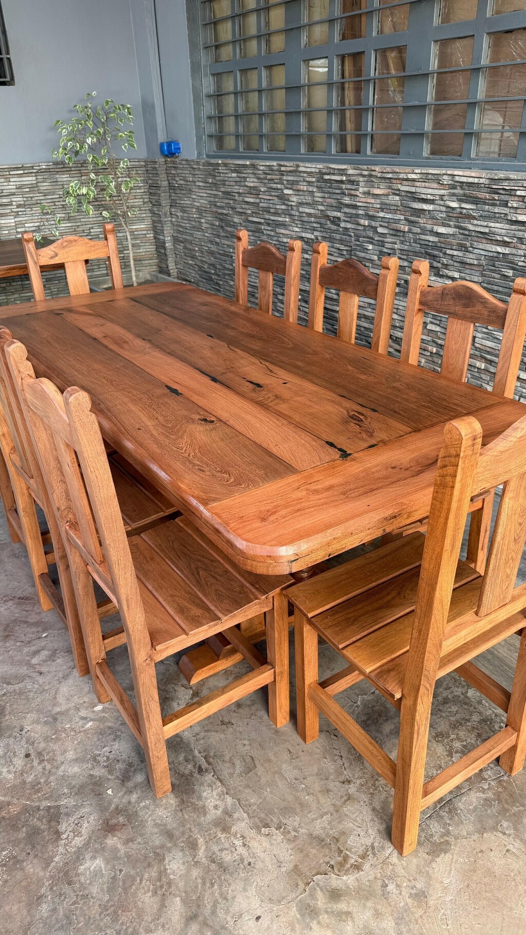 Características: - Material: Resistente algarrobo que realza la belleza natural. - Dimensiones: Mesa de 2.00 metros, perfecta para grandes reuniones. - Confort: Incluye 8 sillas económicas ideales para largas comidas.